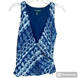 Lauren Ralph Lauren Vneck wrap Silk Linen tank top Cream Indigo Size 4