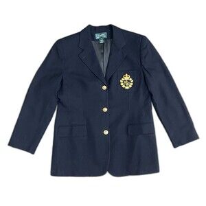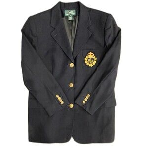 Lauren Ralph Lauren Vtg Blazer Women's 16 Navy Worsted Wool Jacket 3D Gold Crest