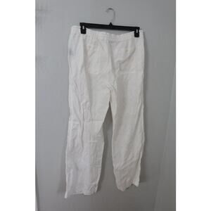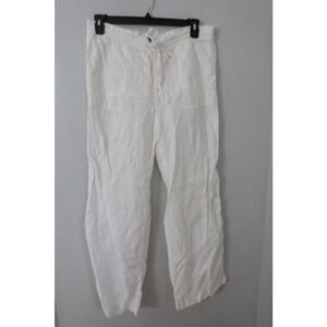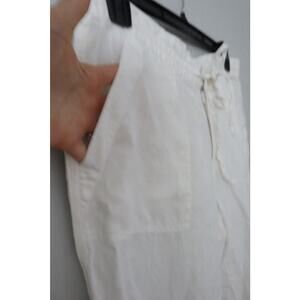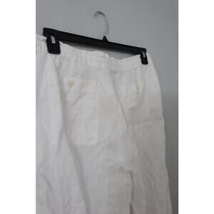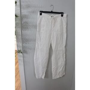 The product is a pair of women's white linen pants by Lauren Ralph Lauren in size 10. The pants feature a loose, wide-leg style with a bloommer fit, wide pockets, and are perfect for a Y2k-inspired look. Made from linen, these pants are comfortable and breathable, making them a versatile addition to any wardrobe.