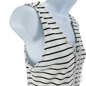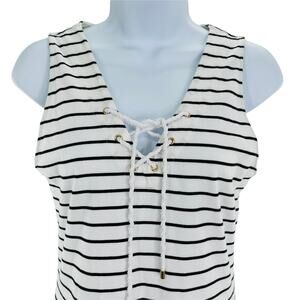 Fresh cotton knit dress in a striped nautical theme features 4" side slits and lace up bodice. Sleeveless.