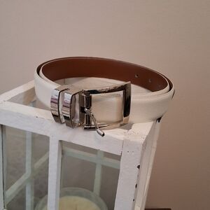 Elegant white belt with silver buckle. Brown interior adds contrast. Perfect for any occasion.