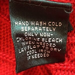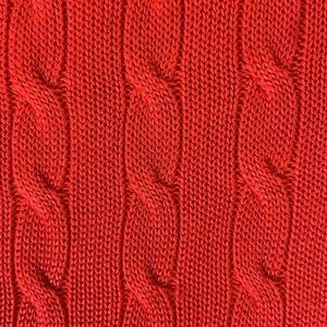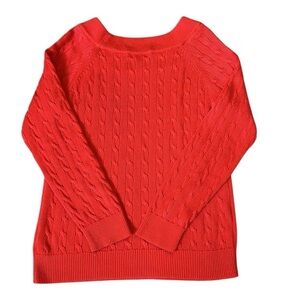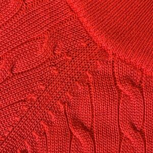 Lauren Ralph Lauren scoop/wide neck cable knit sweater in a stunning shade of red. Silky cotton blend that makes the sweater soft and comfortable. Not heavy so can be worn in multiple seasons.