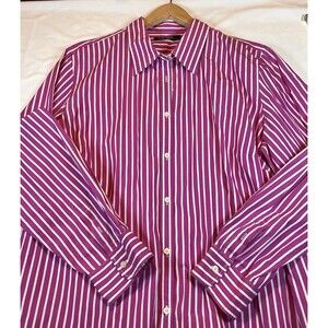 This is a Lauren Ralph Lauren women's button-up shirt in size 18W. It features a pink and white striped pattern with a collared neckline and long sleeves. The shirt is made of 100% cotton and has a button front closure. It is a casual style suitable for everyday wear.