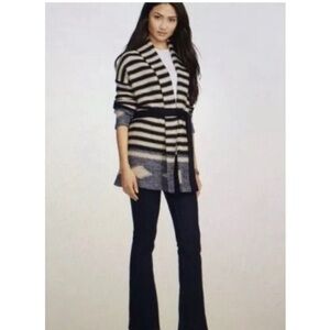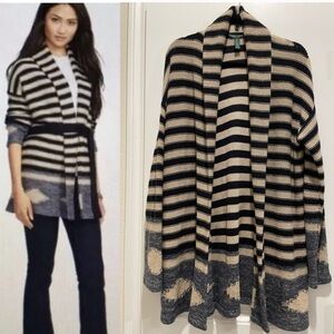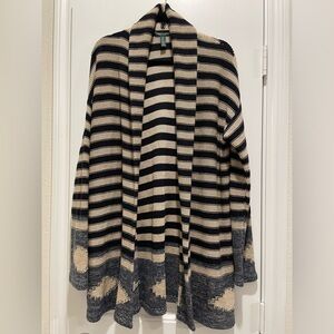 LRL Blue & Cream Striped Navajo Linen Cotton Blend Open Front Longline Cardigan