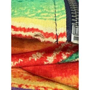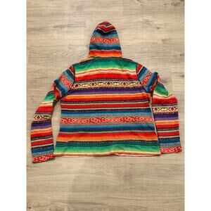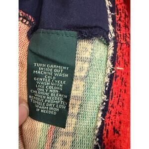 The Lauren Ralph Lauren Women's Zip Up Hoodie Jacket in size XL features a vibrant Aztec Southwestern tribal pattern on a cotton outer shell. This mid-length jacket is perfect for travel and casual occasions, with a soft cotton lining and polyester insulation for warmth. The jacket has a full zip closure, pockets for convenience, and a multicolor design that adds a pop of color to any outfit. Whether it's winter, fall, or spring, this lightweight and stylish jacket is a versatile addition to any woman's wardrobe. The jacket is in good pre-owned condition. The jacket has a small hole at the bottom of jacket. See last picture.