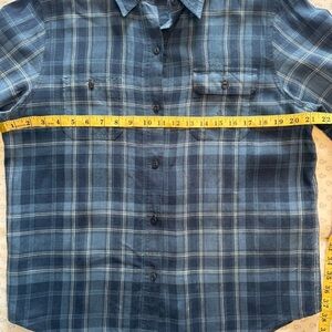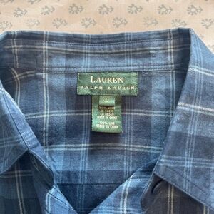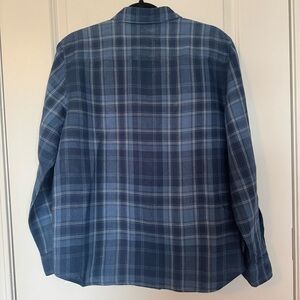 Stylish Ralph Lauren blue plaid button-up shirt. Perfect for casual wear. Sleeves can be rolled up with a buckle or worn down. Two front pockets. Quality made 100% Linen. Excellent condition !