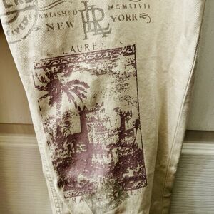 These are Lauren Ralph Lauren Women's 18 Relaxed Taper Ankle Jeans in a Cream Wash Print. They feature a 5-pocket design with a high rise and a relaxed fit. Made of 100% cotton denim, these jeans have a graphic print design, zipper and button closure, and the Polo Ralph Lauren logo accents. The inseam is 27 inches, suitable for summer, fall, and spring wear. Ideal for those who appreciate a bohemian, retro, or preppy style.