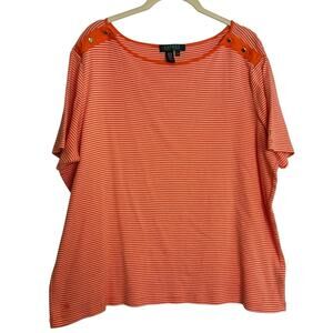 Lauren Ralph Lauren Womens 2X Orange White Stripe Cotton Tee Gold Button flaw