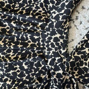 Stylish black and beige abstract patterned dress for a polished look. Ideal for professional or casual settings.