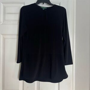 Keywords: Lauren Ralph Lauren, women's blouse, black blouse, peplum hem, keyhole neckline, long sleeve, casual wear, fall fashion, machine washable, polyester blend, elegant top, versatile blouse, regular fit, solid pattern, pre-owned.