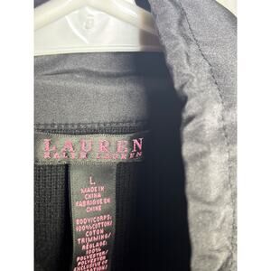 Women’s Lauren Ralph Lauren Pink Black Active Zip Up Collar Jacket With Pockets. Cotton and polyester. This says Large but measures as a medium.