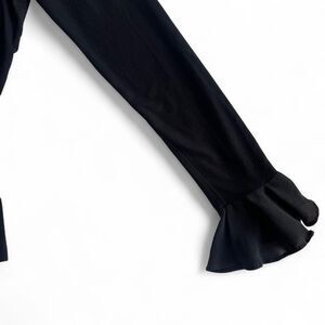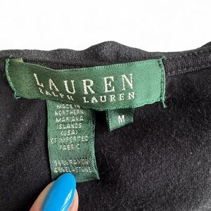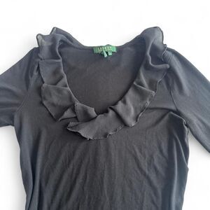 Keywords: Lauren Ralph Lauren blouse, women's size medium top, black v-neck blouse, ruffle long sleeve blouse, workwear blouse, business casual top, elegant dressy blouse