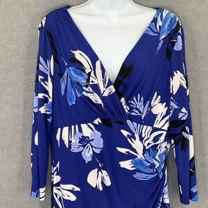 Keywords: Lauren Ralph Lauren, Floral dress, Blue dress, Midi dress, Long sleeve dress, Women's dress, Size 16, Floral print, Ruched dress, V-neck dress, Daytime dress, Business casual