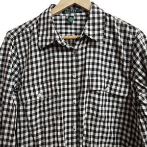 Lauren Ralph Lauren shirt, gingham button-down, women's cotton shirt, cream and brown checkered shirt, XL women's top, Ralph Lauren classic fit, long sleeve collared shirt.
