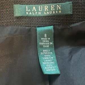 Brand: Lauren Ralph LaurenType: JacketSize: 8Material: 100% LinenColor: BlackStyle: Textured Woven / Moto-InspiredFeatures: Zip front, Long sleeves, Stand collar, Front zip pocketsFit: RegularCondition: Excellent pre-ownedDescription:Elegant Lauren Ralph Lauren women’s jacket in size 8, crafted from 100% linen with a unique textured woven finish. Features a sleek moto-inspired silhouette with a full zip front, stand collar, adjustable back waist and two front zippered pockets.Measures approximately chest 36", length 22", sleeve 25".Perfect for dressy casual wear, office layering, or evening outings. High-quality construction and timeless Ralph Lauren style.