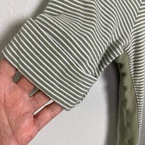 Sage green and white stripes with green ribbing along sides and neckline. Cuffed sleeves.