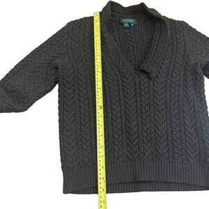 The Lauren Ralph Lauren Women's Petites Green Cable-Knit V-Neck Sweater is a stylish and classic piece of clothing made from pure cotton. The sweater features a solid green color, cable-knit pattern, long sleeves, and a V-neckline, making it a versatile and comfortable option for everyday wear. With its regular fit and pullover style, this sweater is perfect for the modern woman looking to add a touch of sophistication to her wardrobe. Made by the renowned brand Lauren Ralph Lauren, this sweater is sure to become a timeless staple in any woman's closet. 20.5" from top of shoulder to bottom of sleeve. See photos for measurements.