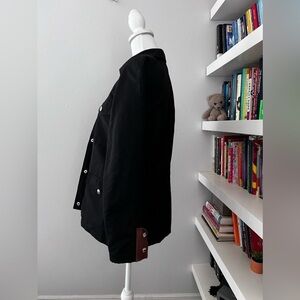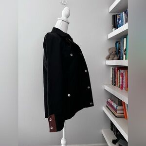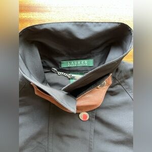 Lauren Ralph Lauren Women's Utility Jacket in Black Color with Brown Lamb Leather Details on Sleeves. Four Front Flap Pickets. Hidden Zipper. Logo on Buttons. Perfect for many different types of weather conditions.