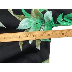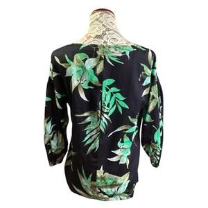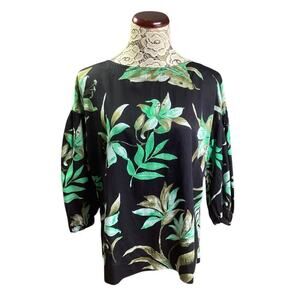 Printed Bishop-Sleeve Blouse black background with a green floral print. Three-quarter length bishop sleeves and a relaxed fit. Made of crisp cotton and has dropped shoulders.
