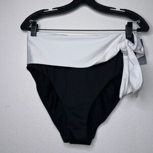 A contrast waistband flows to a tie at the side, bringing chic sophistication to these high-waist bikini bottoms.