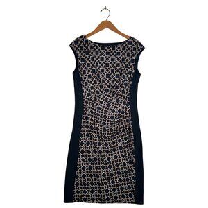 Lauren Ralph Lauren Womens Size 12 Midi Dress Sleeveless Scoop Neck Gold Chain Link on Black Side Panels. Sheath Asymmetrical Side Waist Cinch.