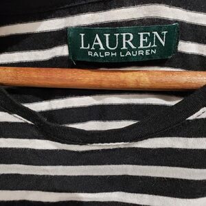 This is an elegant Lauren Ralph Lauren Women's Short Sleeve Top featuring a classic Striped pattern and unique Shoulder Detail. This comfortable cotton blend top is sized approximately Large (L). This top is missing the size tagBuyer must confirm fit with measurements.