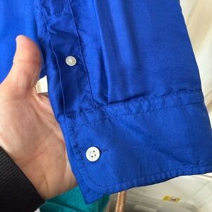 Bold royal and regal, this cobalt blue silk shirt is very eye catching. Buttons for rolling up the sleeves, full collar and front pockets.