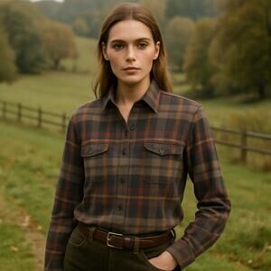 This wool plaid shirt channels an old money, heritage-inspired look that pairs perfectly with jeans, boots, and layered outerwear — a versatile piece that aligns with current trends like quiet luxury, rustic Americana, and timeless prep.