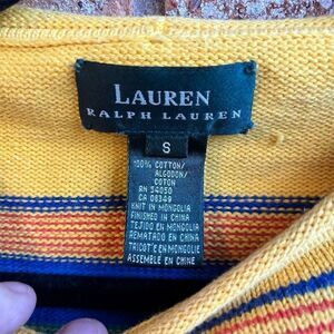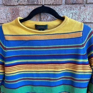 Keywords: Lauren Ralph Lauren, pullover, sweater, multicolor, striped, cotton, vintage, casual, women's fashion, size S, comfortable, cozy, pre-owned, relaxed fit, brunch.