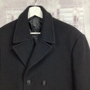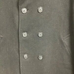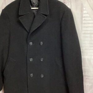 Black but in some lights can appear dark gray double breasted pea coat. Cashmere and wool blend, quilted lining, outer and inner pockets. Good used condition.