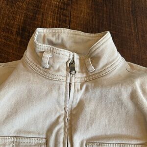 Nice preowned condition. Missing strap that was around neck, but docent detract from the look. Cotton blend. Zips up the front. Has 4 button flap pockets and one zipper pocket.