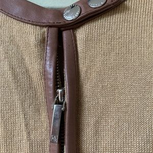 Great fine-gauge cardigan. 86% silk; 14% cashmere; leather trim. Front zipper.