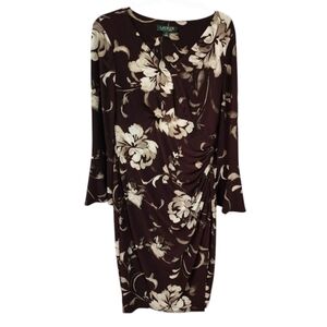 This Lauren Ralph Lauren dress is an elegant and feminine piece, featuring a rich burgundy base with a floral pattern in neutral tones of cream and beige. The dress is designed with a flattering silhouette, highlighted by a gently draped and ruched detail along the front, which enhances the waistline and adds a touch of sophistication.
