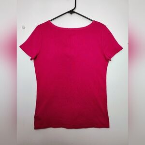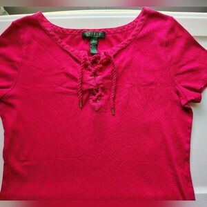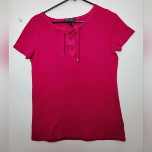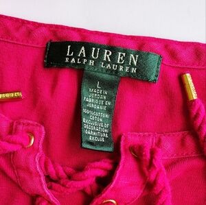 Lauren Ralph Lauren top blouse V neck tie, cotton casual relaxed outfits colorful pink size L, 100% cotton, adjustable straps at neck, cotton that stretches, chest measurement of 18 inches, length of 25 inches, clean garment in excellent condition.