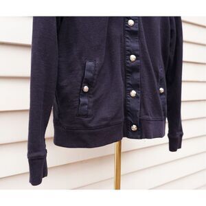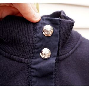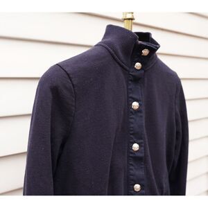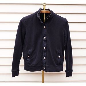 - Chic and versatile 100% cotton navy blue knit casual snap front mock neck jacket with silver crest detail buttons by Lauren Ralph Lauren