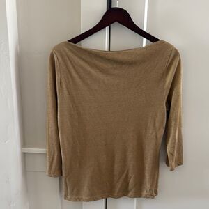 Elegant Tan metallic gold top with 3/4 lengh sleeves. Ideal for versatile styling.
