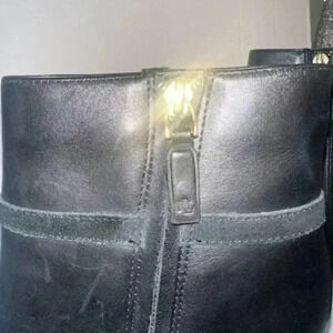 Blending authentic equestrian elements with modern style, Lauren Ralph Laurens high-heeled Marleigh bootie is crafted from burnished leather trimmed with supple suede. A cutout leather monogram and a stirrup-inspired LRL zipper pull tab complete the look.