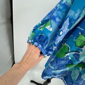 This silk top combines elegance and comfort with a delicate floral watercolor design, a flattering drawstring neckline, and voluminous balloon sleeves. Elevate your wardrobe with this versatile piece.