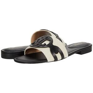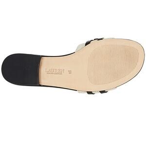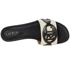 The Lauren Ralph Women's Alegra Logo Canvas Slide Sandal in Natural/Black, size 6M (6B), is a stylish and comfortable option for casual or business occasions. Featuring a solid color design with a slip-on closure, this sandal is made with leather lining and upper material, ensuring durability and quality. With a flat heel style and comfortable features like toning and leather insole, this sandal is perfect for the summer and fall seasons. The Lauren Ralph Lauren brand and the Alegra model add a touch of sophistication to this practical yet fashionable shoe.