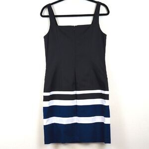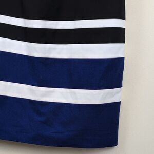 Lauren Ralph Lauren Sleeveless Black Sheath Mini Dress. Classic RLR dress with a hidden zipper in the back and zipper pockets in the front. Gorgeous black dress with white and blue stripes on the skirt.