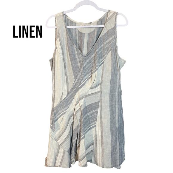 Lauren Vidal LINEN Grey Striped Sleeveless Tank Top Tunic Asymmetrical Lagenlook