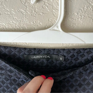DETAILS: Lauren Vidal size small, Aspen style in navy blue jacquard geometric print, slim silhouette. Polyester polyamide spandex, dry clean.