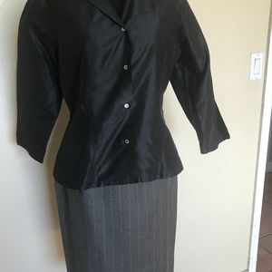 100% worsted wool skirt. Fully lined. back zipper with 1 buttoned back pocket. Great professional style skirt for business look. Grey with pin stripe. length: 23 inches