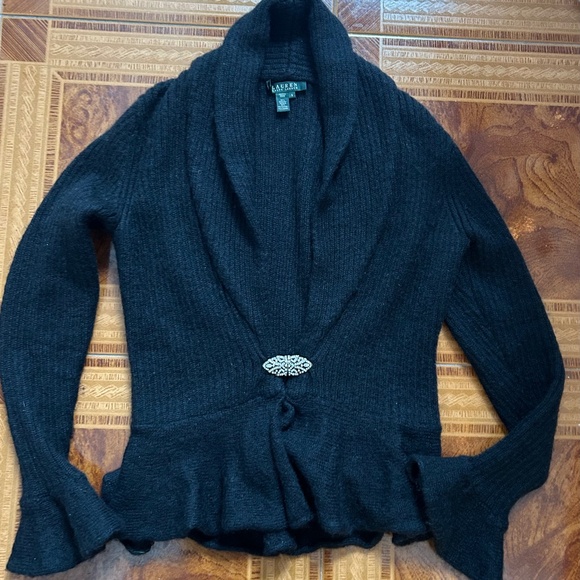 Gorgeous Lauren by Ralph Lauren black mohair sweater Size Small. Has ruffle detail at wrists and bottom of sweater.