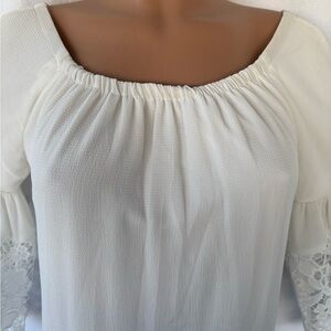 Style and Design: It's a shift dress with an elastic neckline, allowing it to be worn on or off the shoulders. A key feature is its beautiful lace bell sleeves.