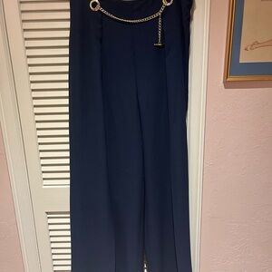 Step out in style with this elegant navy wide-leg pleated pants with chain belt accent at waist Georgette material Perfect for any occasion, it offers a sophisticated look with its sleek design.