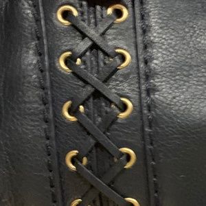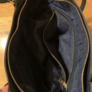 Navy Lauren by Ralph Lauren Leather Bag - crossbody strap option can be removed. Gold hardware and fun stitching design on front of bag. Very roomy inside with with side pockets and zipper pockets. 16" x 9" x 7" but widens towards top - Lots of room! Light usage but in great condition!