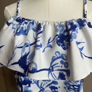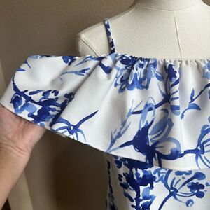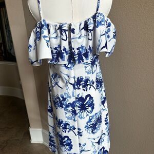 Sleeves have straps with ruffled off the shoulder sleeves. Beautiful vibrant blue floral print on white dress. Dress loose fitting, boxy and comfy. Perfect for spring and summer seasons. Dress has lining as well. Length top of shoulder to bottom of dress is 36”, bust is 17”.