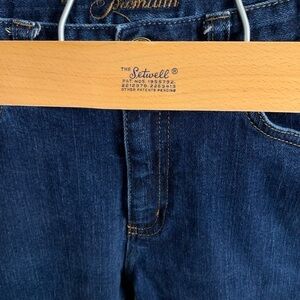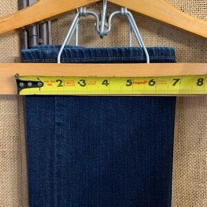 Bottom hem measures 7” . 5 pocket jeans classic straight with leather belt identification tag.