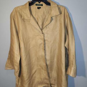 Linen lapel collar button down shirt 3/4 sleeves khaki woven pattern